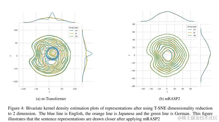 使用T-SNE对英、日、德三种语言同义句的语义空间表征降维后可视化,发现使用mRASP(b)比基线transformer更好的拉近了多语言同义句的语义表征。