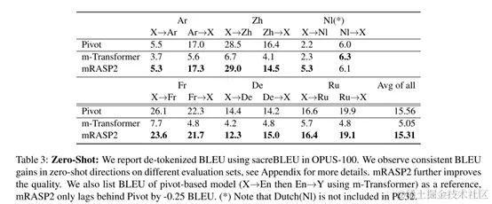 即使是在零资源翻译(非英语对翻译)上性能也很卓越,和桥接模型差不多(pivot)。