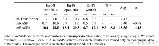 相比多语言基线模型m-Transformer,mRASP2在表中的10个方向上都有显著的提升。