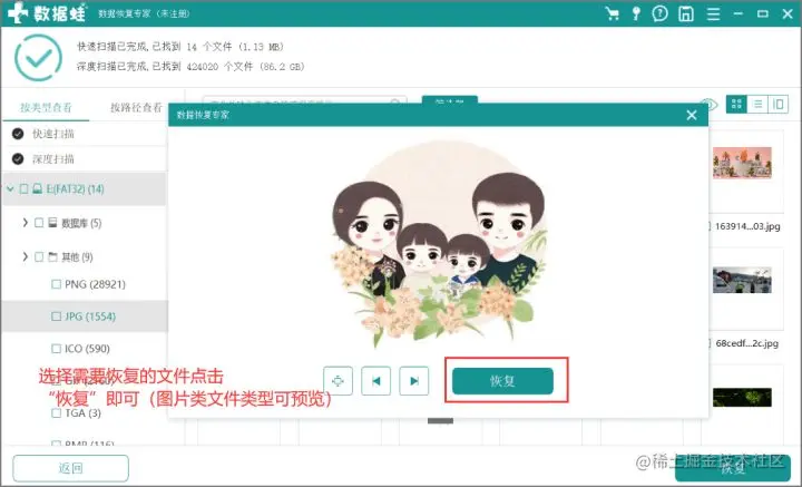 步骤5.找到并勾选需要恢复的文件点击恢复即可(图片文件类型大部分可先进行预览)。