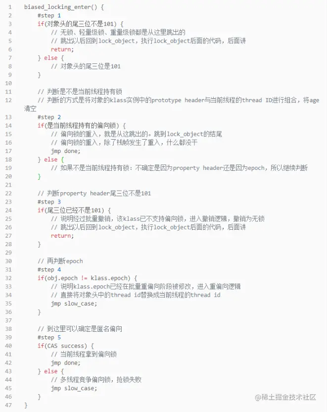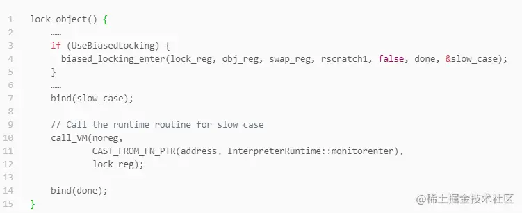 这个方法这里有个判断,如果启用了偏向锁就调用biased_locking_enter。如果没有启用,或者biased_locking_enter执行结束回来,后面代码是抢占轻量级锁、轻量级锁重入、膨胀成重量级锁逻辑。后面讲轻量级锁、重量级锁细讲。