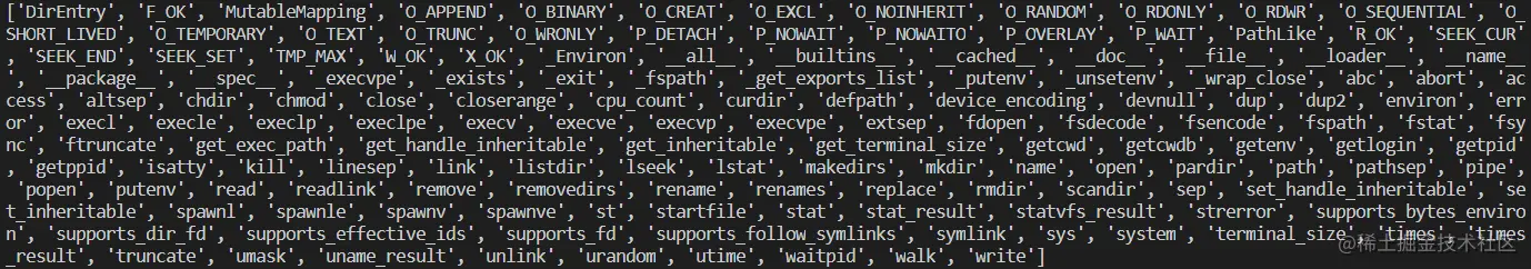 ['DirEntry', 'F_OK', 'MutableMapping', 'O_APPEND', 'O_BINARY', 'O_CREAT', 'O_EXCL', 'O_NOINHERIT', 'O_RANDOM', 'O_RDONLY', 'O_RDWR', 'O_SEQUENTIAL', 'O_SHORT_LIVED', 'O_TEMPORARY', 'O_TEXT', 'O_TRUNC', 'O_WRONLY', 'P_DETACH', 'P_NOWAIT', 'P_NOWAITO', 'P_OVERLAY', 'P_WAIT', 'PathLike', 'R_OK', 'SEEK_CUR', 'SEEK_END', 'SEEK_SET', 'TMP_MAX', 'W_OK', 'X_OK', '_Environ', '__all__', '__builtins__', '__cached__', '__doc__', '__file__', '__loader__', '__name__', '__package__', '__spec__', '_execvpe', '_exists', '_exit', '_fspath', '_get_exports_list', '_putenv', '_unsetenv', '_wrap_close', 'abc', 'abort', 'access', 'altsep', 'chdir', 'chmod', 'close', 'closerange', 'cpu_count', 'curdir', 'defpath', 'device_encoding', 'devnull', 'dup', 'dup2', 'environ', 'error', 'execl', 'execle', 'execlp', 'execlpe', 'execv', 'execve', 'execvp', 'execvpe', 'extsep', 'fdopen', 'fsdecode', 'fsencode', 'fspath', 'fstat', 'fsync', 'ftruncate', 'get_exec_path', 'get_handle_inheritable', 'get_inheritable', 'get_terminal_size', 'getcwd', 'getcwdb', 'getenv', 'getlogin', 'getpid', 'getppid', 'isatty', 'kill', 'linesep', 'link', 'listdir', 'lseek', 'lstat', 'makedirs', 'mkdir', 'name', 'open', 'pardir', 'path', 'pathsep', 'pipe', 'popen', 'putenv', 'read', 'readlink', 'remove', 'removedirs', 'rename', 'renames', 'replace', 'rmdir', 'scandir', 'sep', 'set_handle_inheritable', 'set_inheritable', 'spawnl', 'spawnle', 'spawnv', 'spawnve', 'st', 'startfile', 'stat', 'stat_result', 'statvfs_result', 'strerror', 'supports_bytes_environ', 'supports_dir_fd', 'supports_effective_ids', 'supports_fd', 'supports_follow_symlinks', 'symlink', 'sys', 'system', 'terminal_size', 'times', 'times_result', 'truncate', 'umask', 'uname_result', 'unlink', 'urandom', 'utime', 'waitpid', 'walk', 'write']