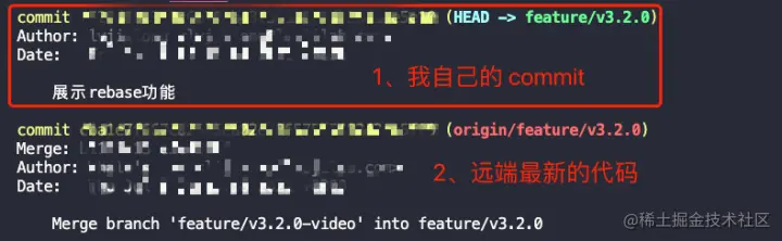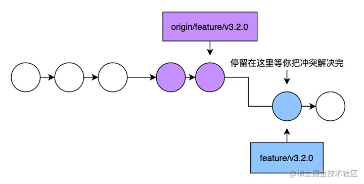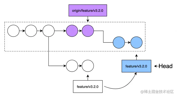 如下图所示。Git 会把 origin/feature/v3.2.0 的远程分支下载下来(紫色的),然后把本地的 feature/v3.2.0 分支上的改动一个一个地提交上去(蓝色的)。