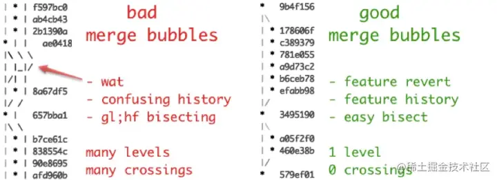 主要是 git-flow 使用 git merge --no-ff 来合并分支,在 git-flow 这样多个分支的环境下会让你的分支管理的 log 变得很难看。如下所示,左边是使用–no-ff 参数在多个分支下的问题。
