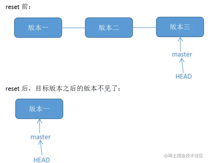 **使用场景:**如果想恢复到之前某个提交的版本,且那个版本之后提交的版本我们都不要了,就可以用这种方法。