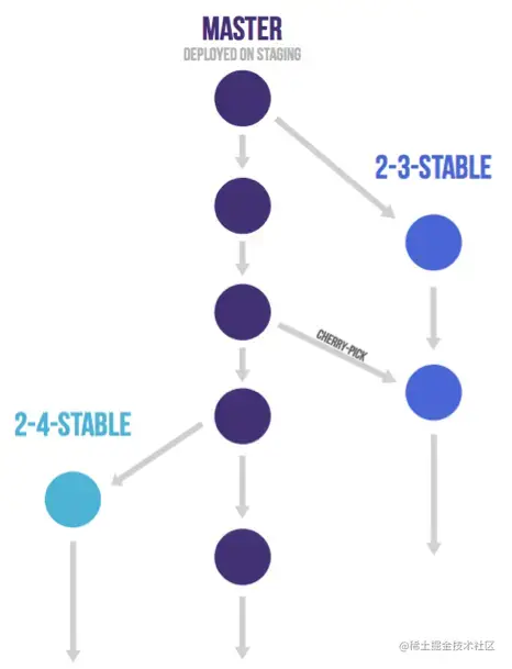 希望有一个分支是非常干净的,上面是可以发布的代码,上面的改动永远都是可以发布到生产环境中的。这个分支上不能有中间开发过程中不可以上生产线的代码提交。