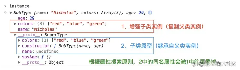 实例对象instance1上的两个属性就屏蔽了其原型对象SubType.prototype的两个同名属性。所以,组合模式的缺点就是在使用子类创建实例对象时,其原型中会存在两份相同的属性/方法。