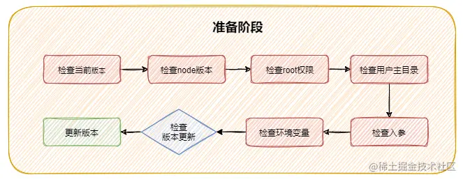 - 准备阶段:在执行命令前需要做的一些事,如:检查node版本,检查脚手架更新,检查用户目录、权限等