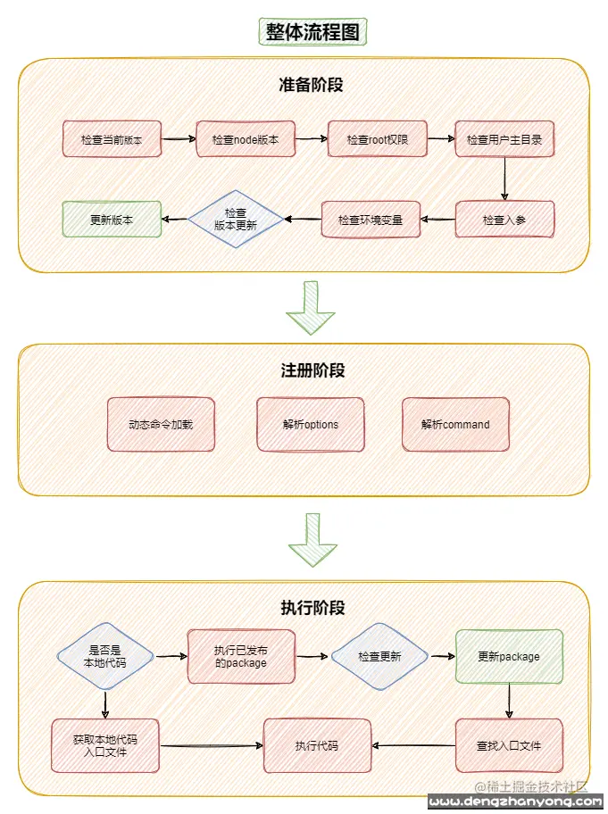 整个脚手架的开发分成三个阶段进行:准备阶段、注册阶段、执行阶段