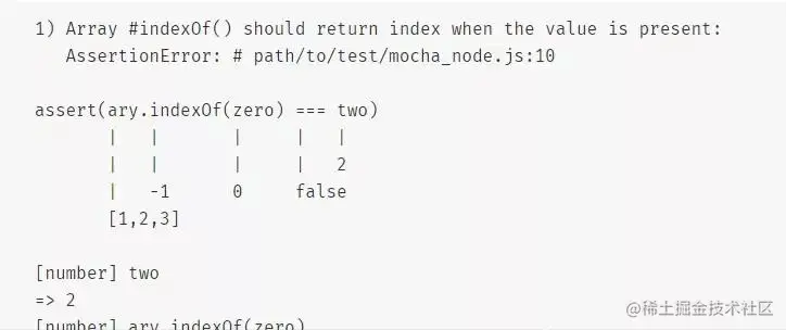 如果你在使用assert的话,无需使用 require('power-assert')来引入power-assert,它的API与assert一样,而且拥有强大的提示信息,如下图所示。