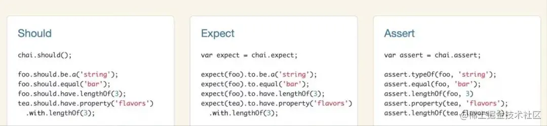 这个断言库很全很强大,提供了常用的assert、should、expect断言关键字。