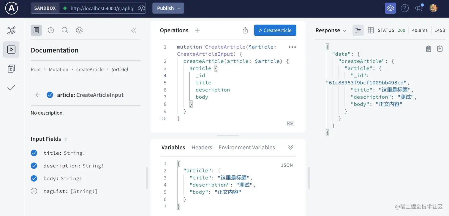 typeDefs内articles查询需要返回一个ArticlePayload,内部有两个字段,将这两个字段的逻辑分开来写,并且打印一下请求状态