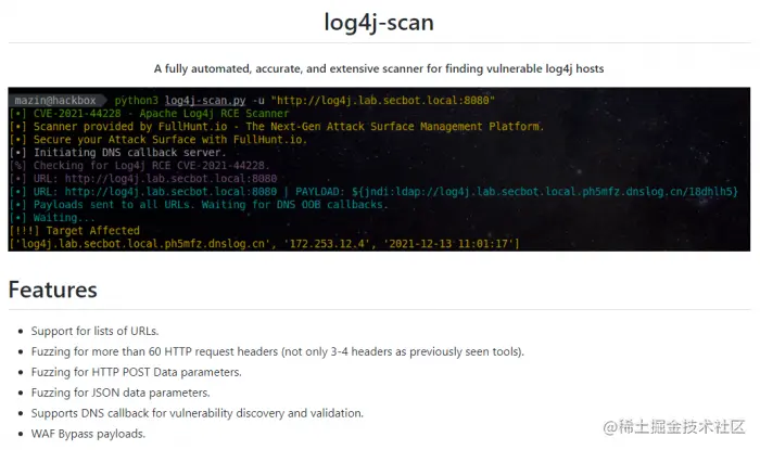 有需要的安全团队,可借助该工具对网络主机进行扫描,以查找 Log4j RCE 暴露和让 Web 应用程序绕过防火墙(WAF)的潜在威胁。