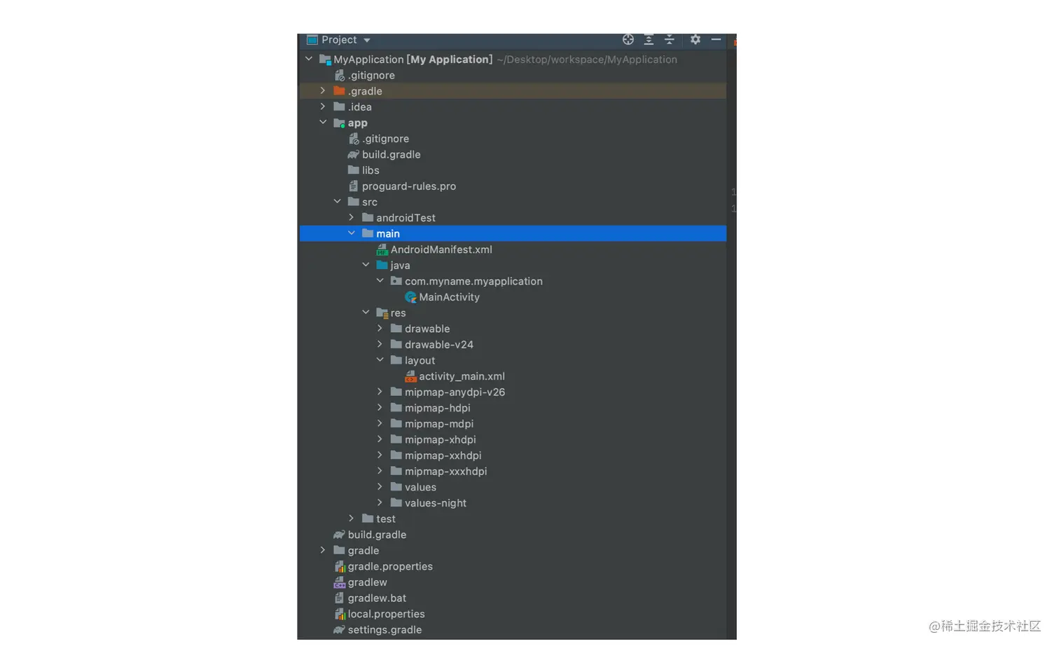 Android 的页面是由一个个 Activity 组成的,页面主要分为 UI 布局部分和逻辑处理部分, UI 布局部分需要由上图中蓝色 main 目录下的 activity_main.xml 文件处理,而逻辑部分则是由 com.myname.myapplication 中的 MainActivity 文件处理。