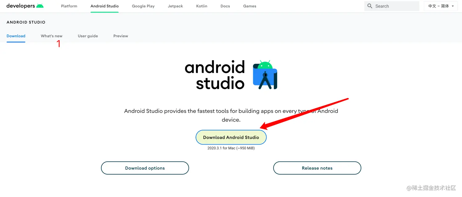 第一步,需要先在 Android 官网下载 Android Studio(直接点击 传送门 进入下载链接), 如果你不会科学上网的话,也可以在 国内镜像 下载。