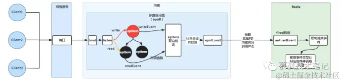 3、Redis调用epoll_wait获取已经就绪的事件的fired数组,fire数组的事件中存储了就绪的FD以及事件类型,遍历数组中的事件,根据事件类型处理函数继续后续的处理。如果是读事件那就调用读事件处理函数进行处理。对于Redis来说它只要关注链表中有没有数据就好,有数据就会进行读取,没有数据则阻塞超过timeout之后再进行调用。在大多数情况下,返回的数组中包含的事件并不多。通过这样的设计,Redis不需要一直轮训检查到底有没有实际的请求发生,避免了CPU资源的浪费。因此及时是单线程的Redis,借助于epoll机制,它也可以实现数十万连接的并发处理。