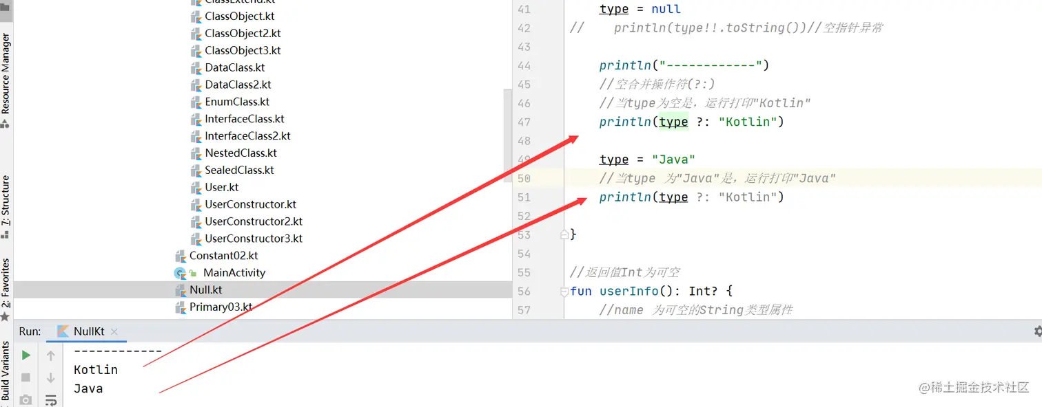 - 可空类型变量?.属性/函数。如果可空类型变量为null时,返回null