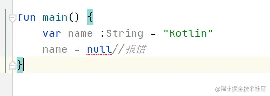 Kotlin区分可空类型和非可空类型,所以,你要一个可空类型变量运行,而它又可能不存在,对于这种潜在危险,编译器时刻警惕着。为了应对这种风险,Kotlin不允许你在可空类型值上调用函数,除非你主动接手安全管理。如下图: