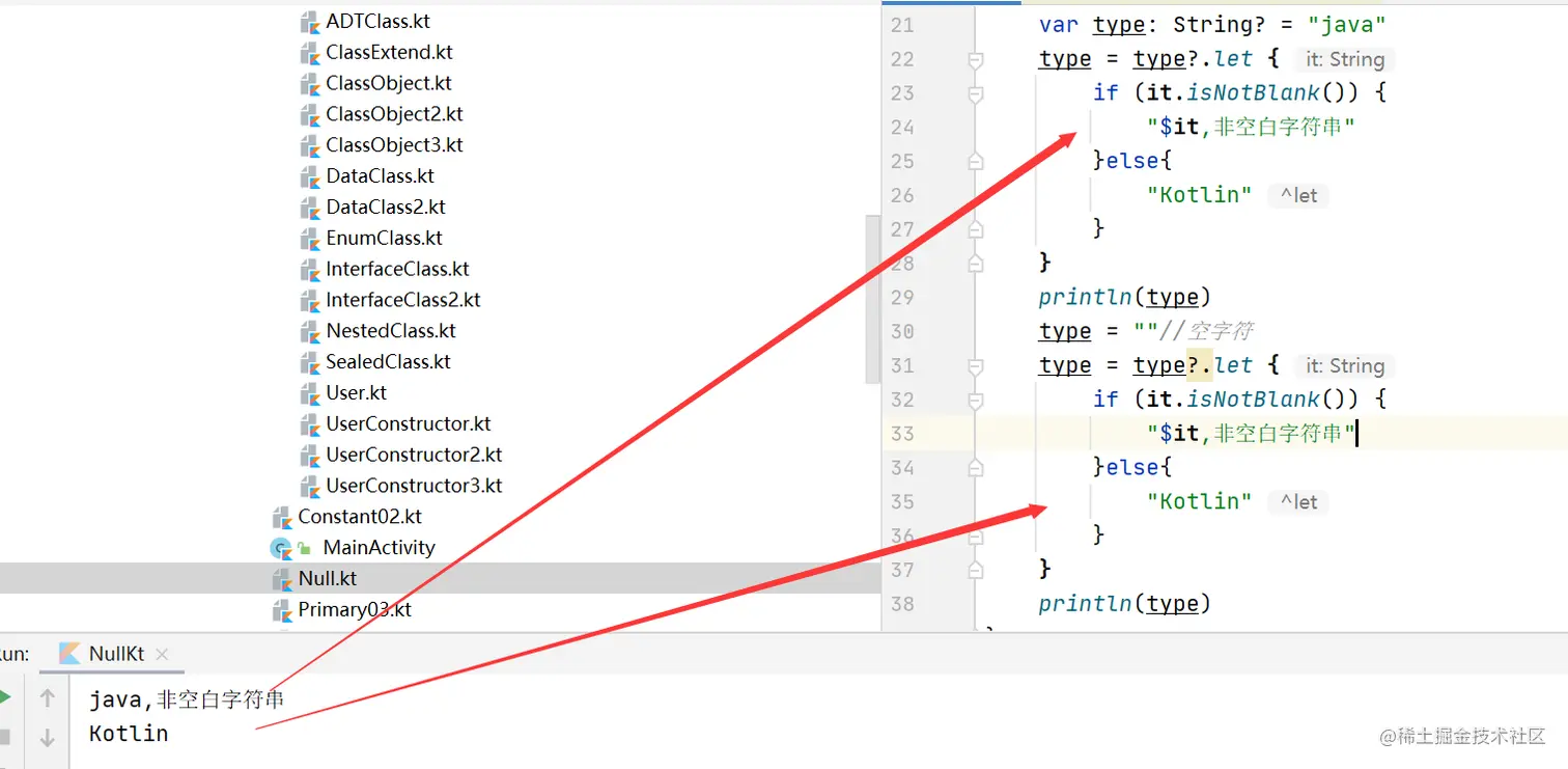 安全调用允许在可空类型上调用函数,但是如果还想做点额外的事,比如创建新值,或判断不为null就调用其他函数,怎么办?可以使用带let函数的安全调用操作符。你可以在任何类型上调用let函数,它的主要作用是让你在指定的作用域内定义一个或多个变量。