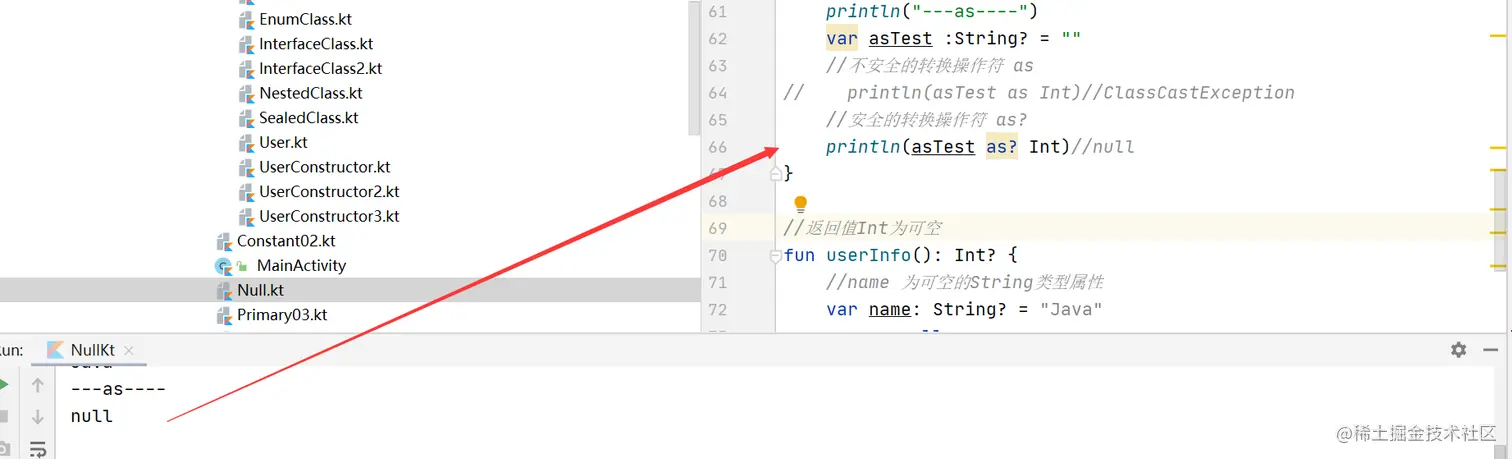 as?安全地转换成一种类型。 如果无法进行转换,则返回null,而不是抛出ClassCastException异常。