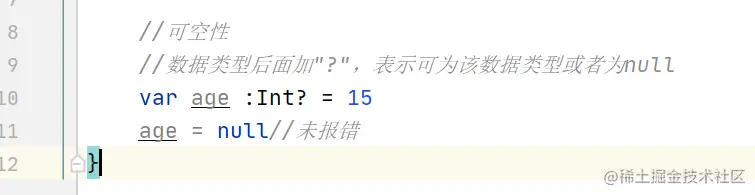 定义一个可空类型的变量的格式为:修饰符 变量名 :类型? = 值