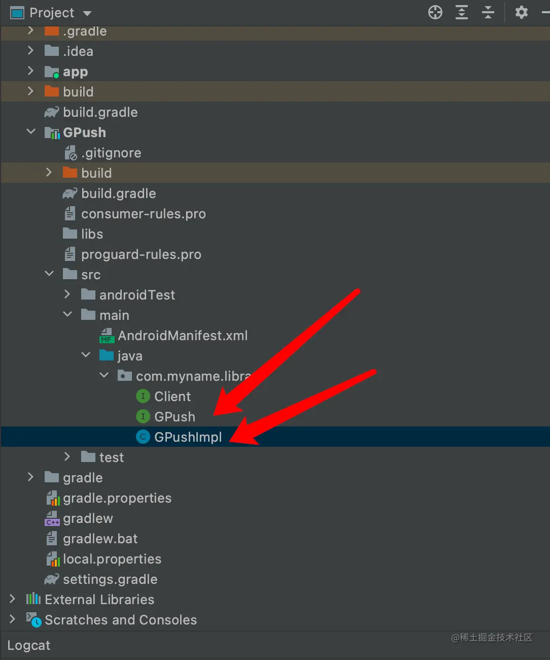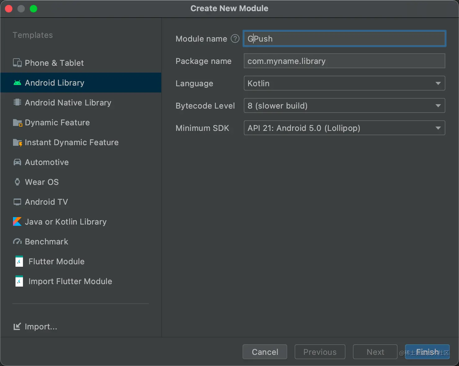 打开上个章节我们创建的示例工程,在工程上创建一个 library module,命名为GPush,让我们模拟实现一个推送简短新闻的接口。