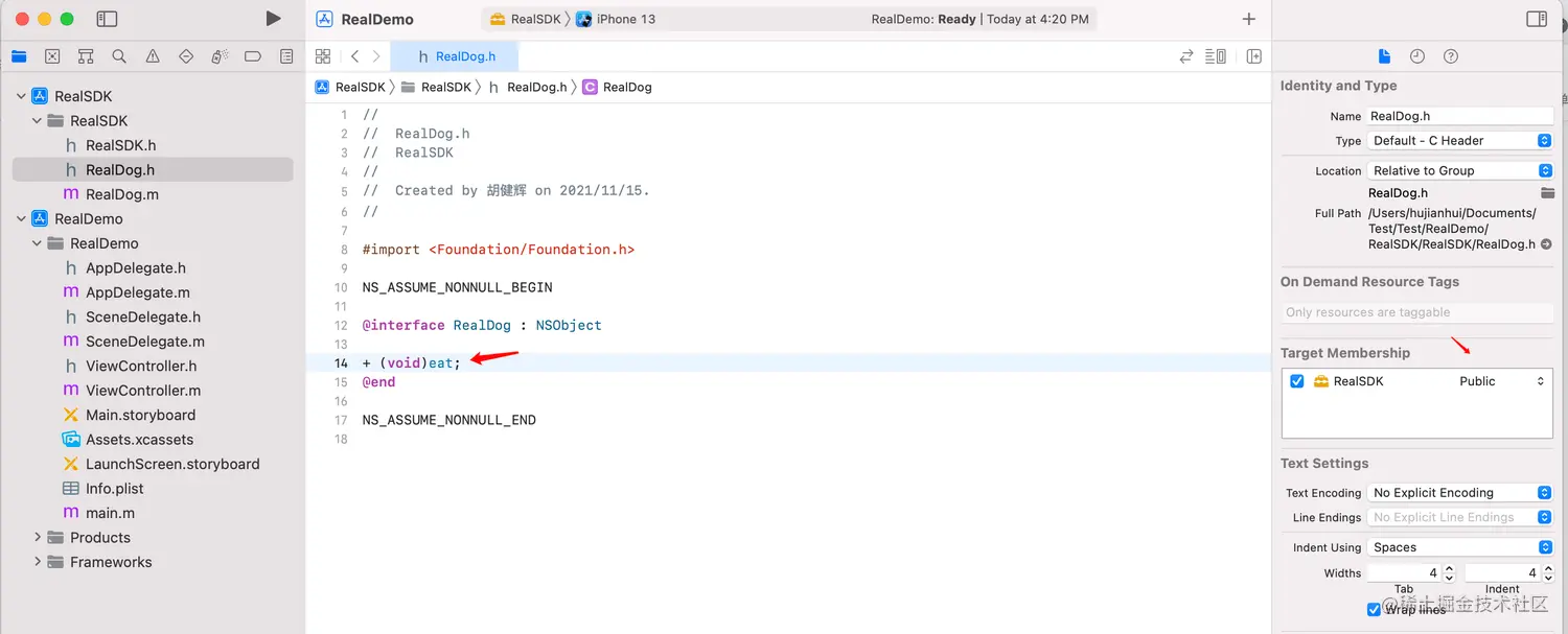 我们需要增加一个 RealDog 类,定义一个 eat 方法,实现里面打印一句话“吃骨头”。然后修改 RealDog.h 的 Target Membership 为 Public,意思为公开头文件。