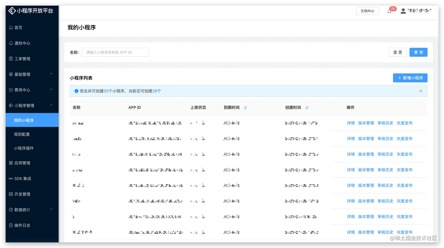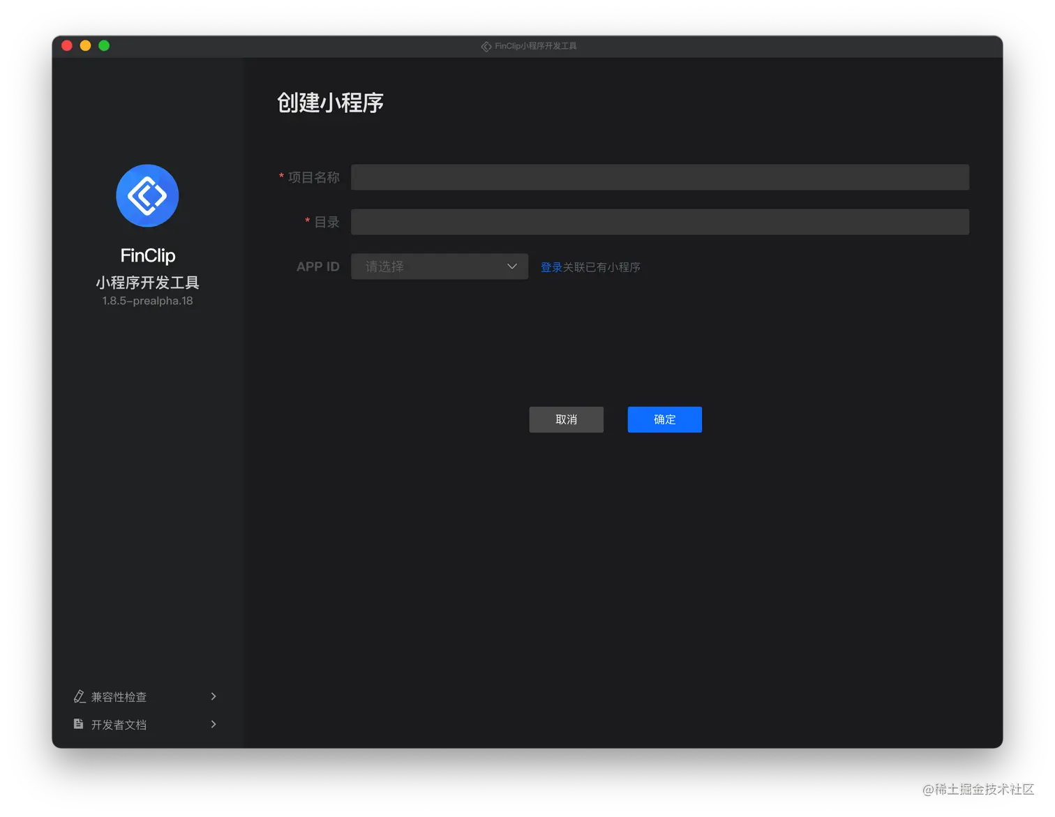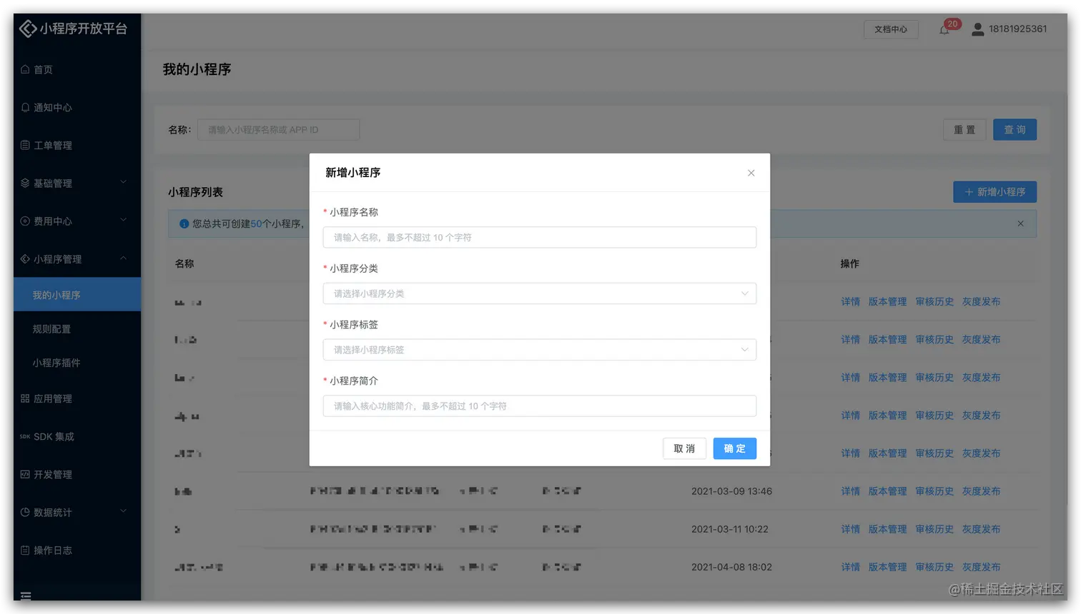 首先访问 FinClip 小程序官网:www.finclip.com/,注册并登录小程序管理后台,分别进入小程序管理 → 我的小程序 → 新增小程序,在填写小程序名称等基础信息后确定创建。