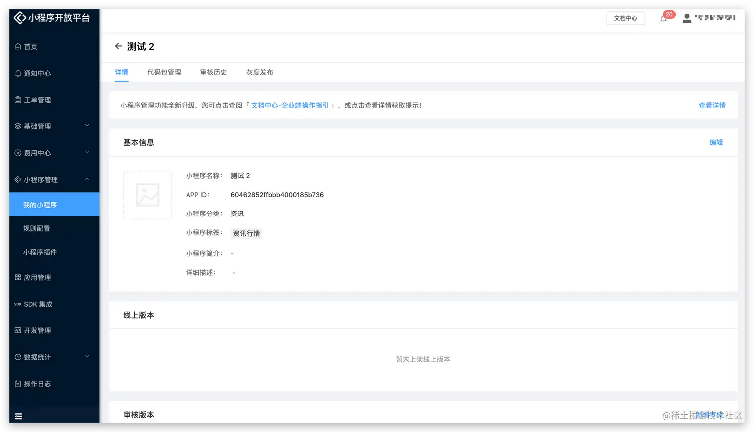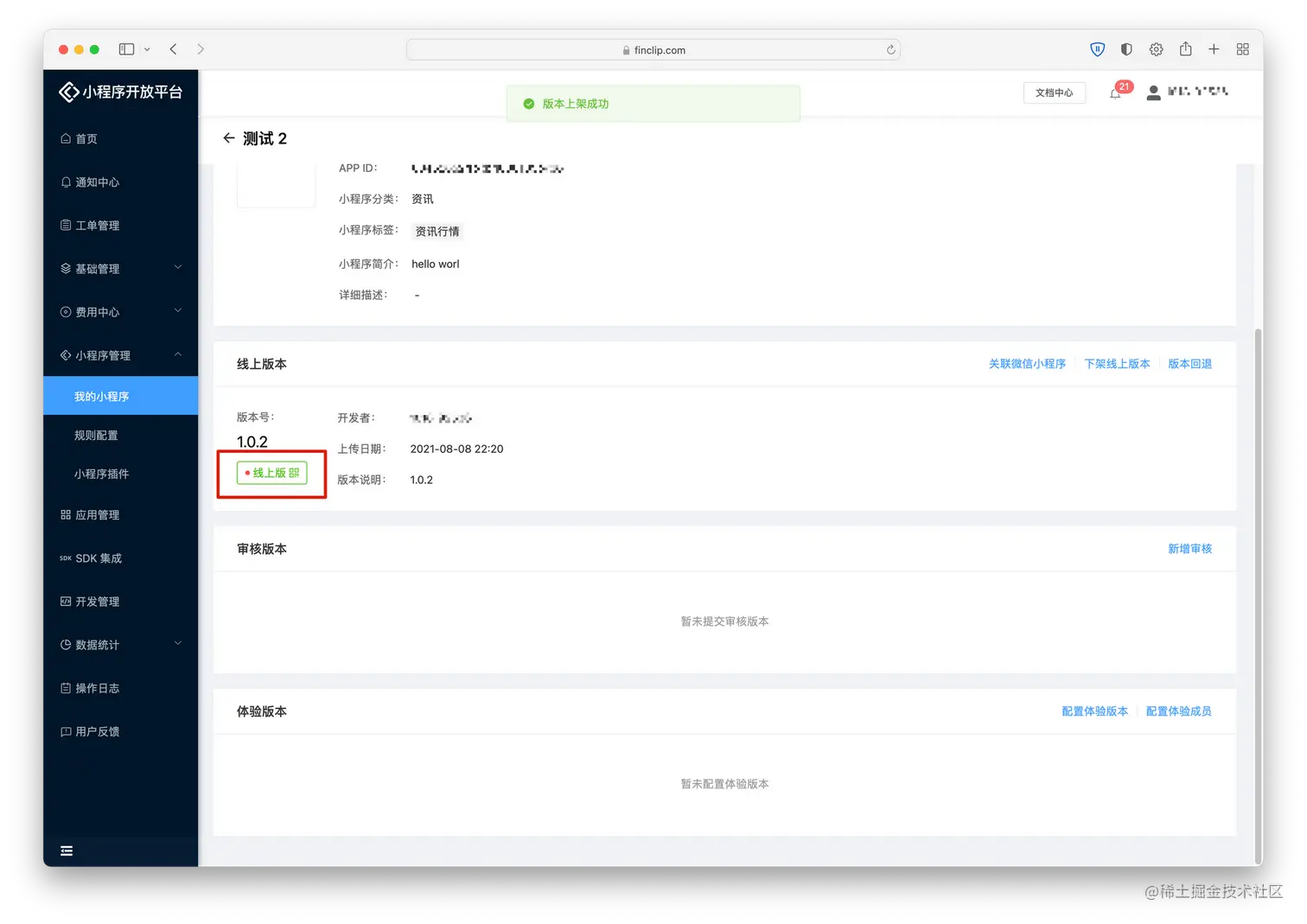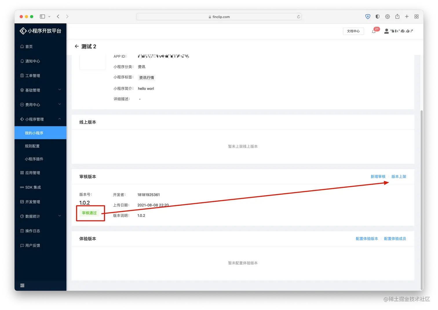此时再次进入 FinClip 小程序管理后台,找到新创建的小程序进入详情页,新增审核版,选择最新上传的小程序版本提交审核。待审核通过后可以上架该版本,点击展示线上版二维码可使用 FinClip App 扫码体验。