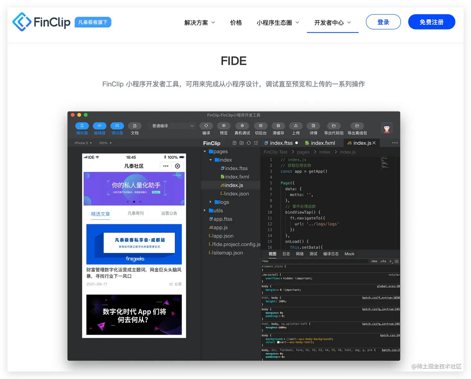 本文将作为抛砖引玉,从小程序开发者角度来介绍小程序基本目录结构、使用语法,和在 FinClip 平台如何快速开发、上传一个简单小程序。更加详细的组件及 API 支持、SDK 集成方法等可以参考 FinClip 小程序文档中心。