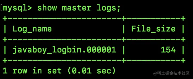 可以看到,我这里目前只有一个日志文件,文件名为 javaboy_logbin.000001,File_size 表示这个文件占用的字节大小是 154。