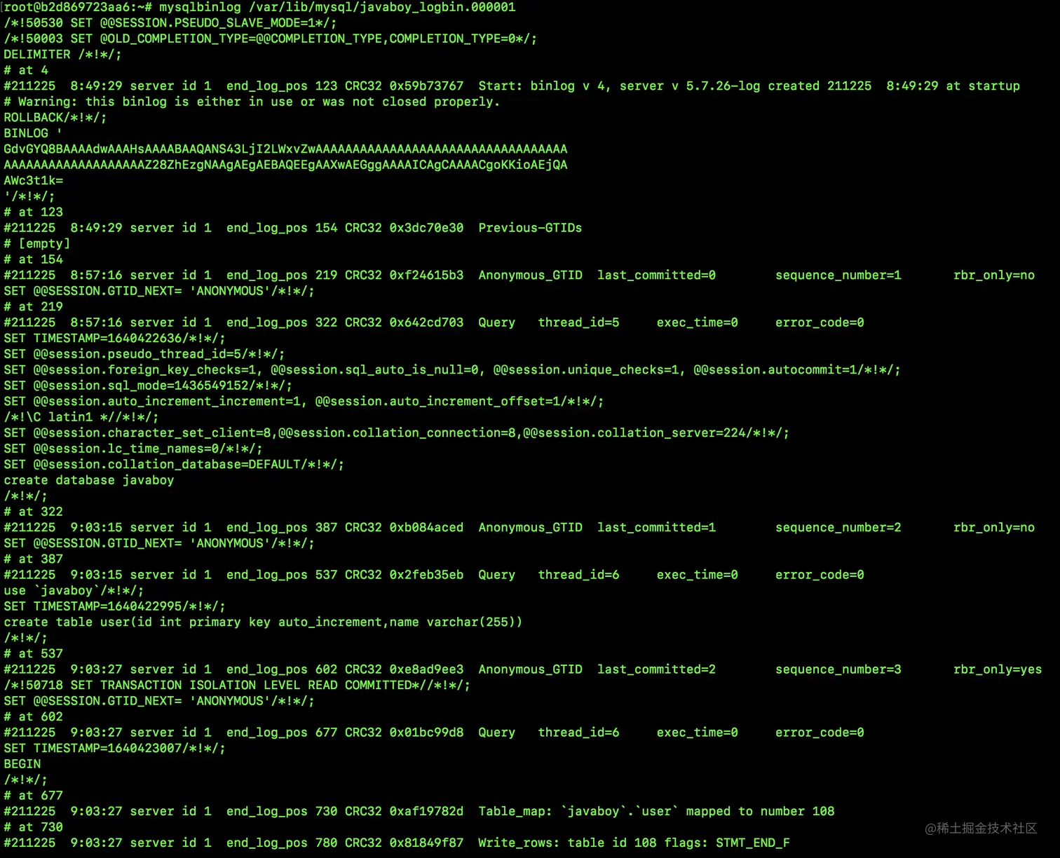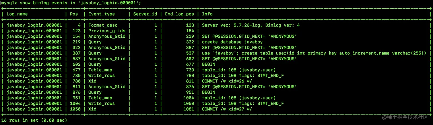 不过这种查看方式不够人性化,我们说 binlog 是按照事件来记录日志的,所以如果我们能够按照事件的方式查看日志,就会好很多,我们再来看看如下一个命令: