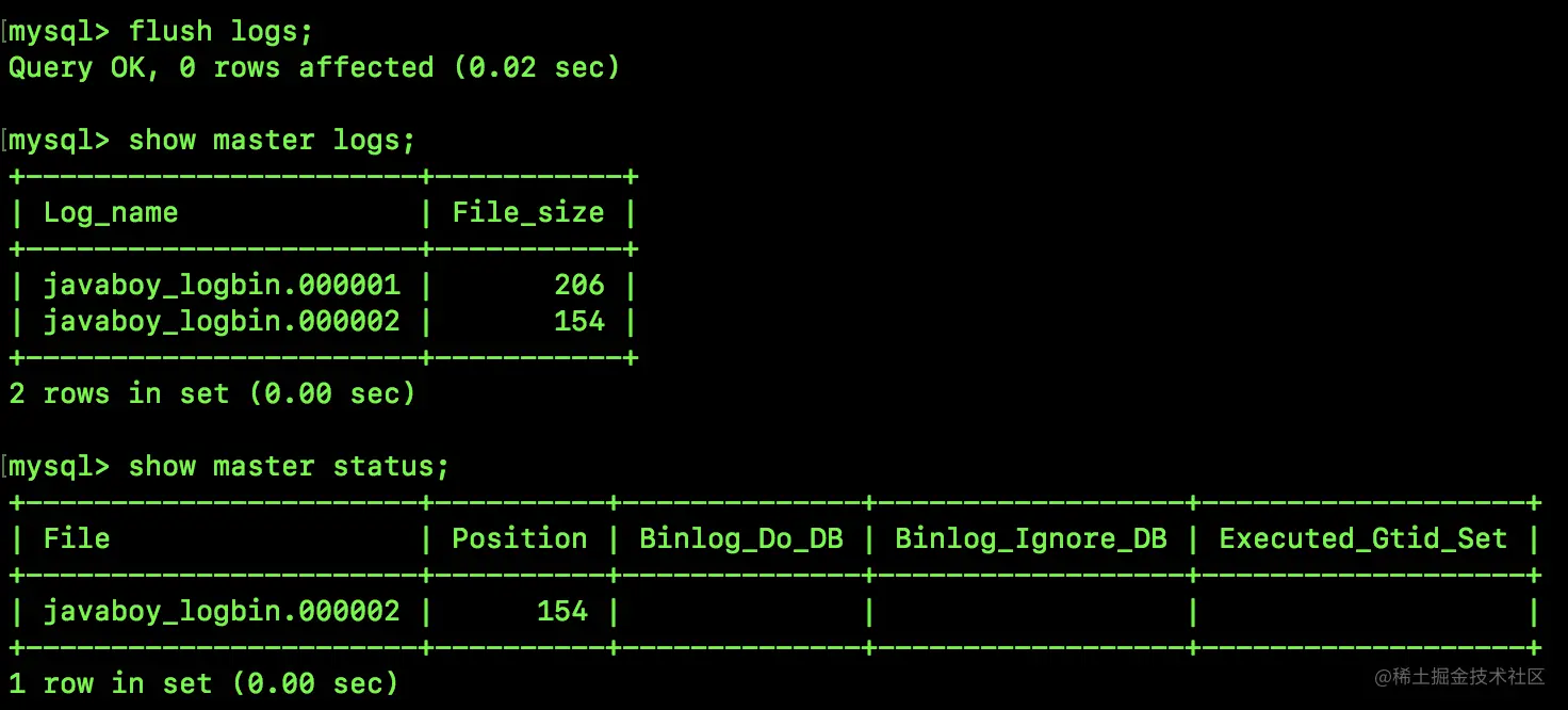 由上图可以看到,我们刷新日志之后,再通过 show master logs 去查看日志,发现日志文件已经多了一个新产生的了,然后再通过 show master status 去查看最新的日志文件信息,发现也已经变为 javaboy_logbin.000002。