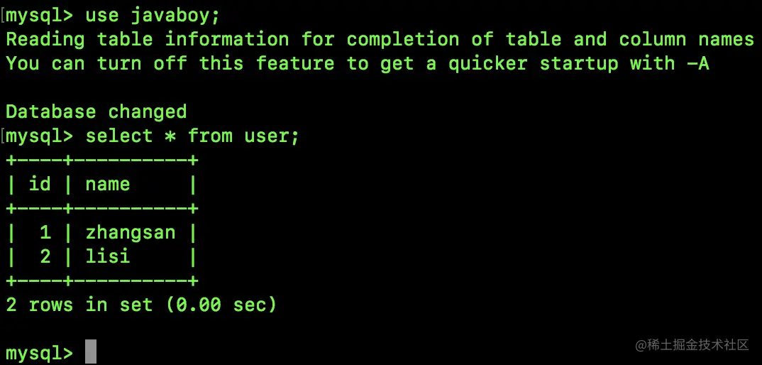 这是一个新安装的数据库,里边我新建了一个数据库名为 javaboy,javaboy 库中新建了一张表名为 user,user 中有两条记录,如下:
