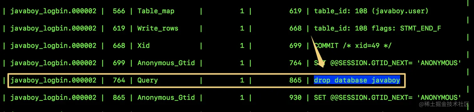 由于 javaboy_logbin.000002 文件是在星期三凌晨三点备份之后产生的新文件,因此这个文件从起始到 764 这个 Pos 之间的操作,就是星期三凌晨三点到删库之前的操作了。