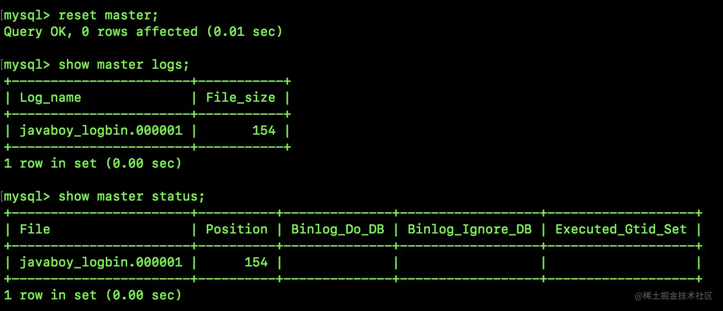 reset master 可以重置 binlog 日志文件,让日志重新从 000001 开始记录,不过如果当前主机有一个或者多个从机在运行,那么该命令就运行不了(因为从机是通过 binlog 来实现数据库同步的,主机把 binlog 清空了,从机会报找不到 binlog 的错误)。