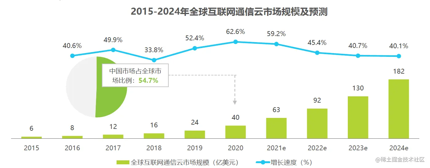预计到 2024 年全球互联网通信云规模将达到 182 亿美元,且市场仍保持 40% 以上的高速增长。