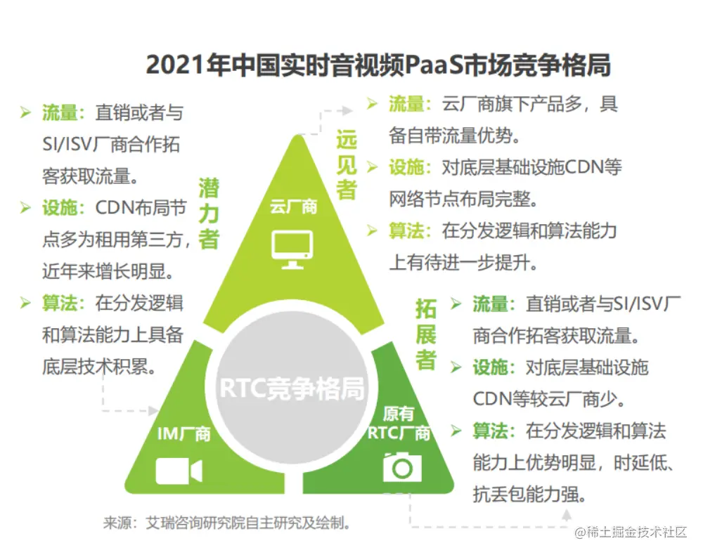 在实时音视频层面,由于 PaaS 需求在疫情和企业数字化转型的刺激下呈现出爆发式增长,头部云厂商和 IM 厂商纷纷加入战局,市场竞争激烈。