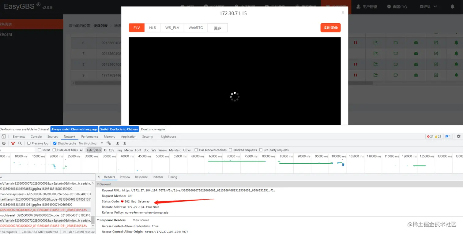 有用户在使用EasyGBS播放视频的时候,视频加载失败,看接口返回的消息为502 bad gateway,但是抓包检查信令的时候发现这些都是没有问题的。