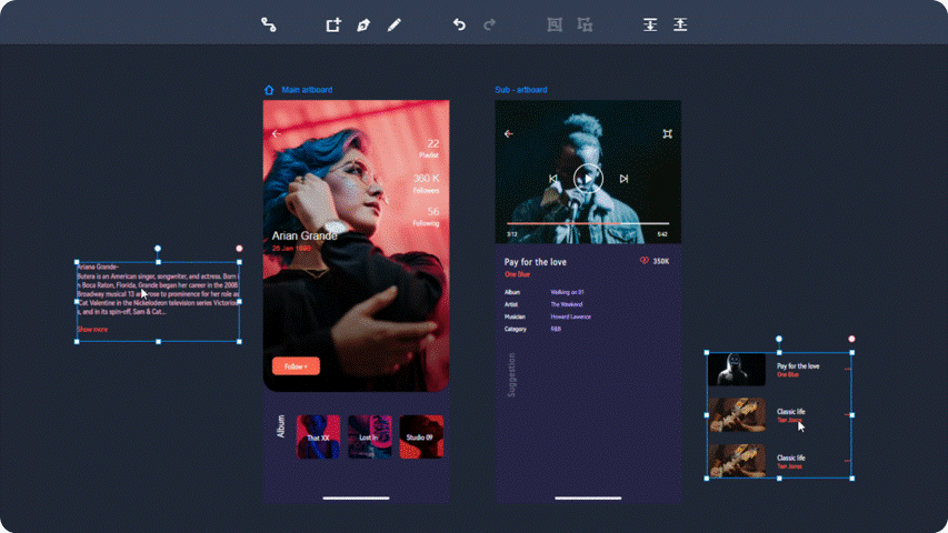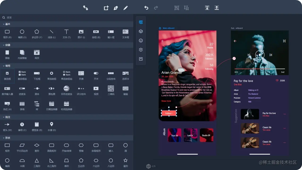 摹客RP没有复杂的中继器、函数概念,通过主辅画板模式搭配交互设置,就可以充分呈现设计内容;
