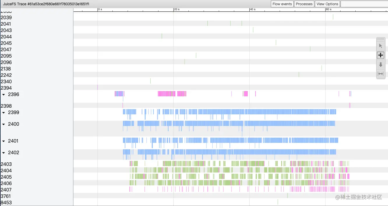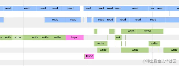 这里先大致介绍下这个图中各种元素含义。我们的一条 oplog 中包含了时间戳,线程 ID,文件系统操作函数(read, write, fsync, flush 等),操作持续的时间等。左侧数字表示线程 ID,横轴表示时间,不同类型操作用不同颜色标记。