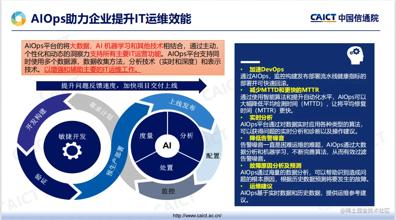 AIOps的落地在多方面直击传统运维的痛点,AI算法承担起分析海量运维数据的重任,能够自动、准确地发现和定位问题,从决策层面提高运营效率,为企业运营和运维工作在成本、质量和效率方面的优化提供了重要支持。
