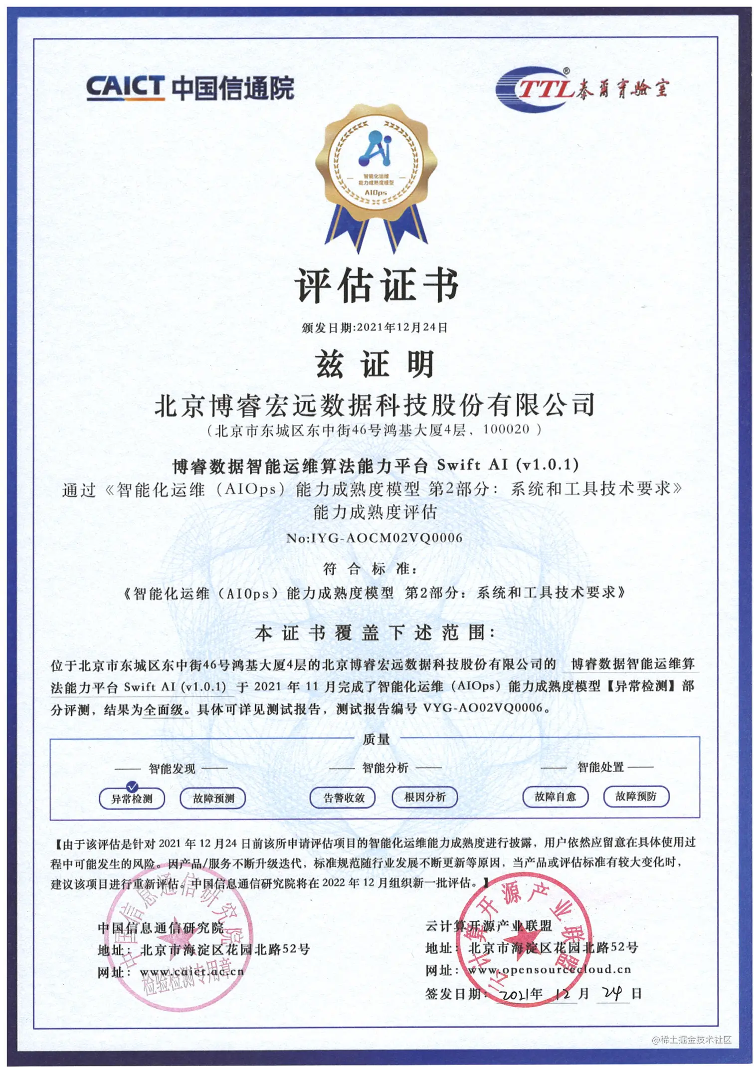 近日,博睿数据的智能运维算法平台Swift-AI,顺利通过了由中国信息通信研究院(以下简称“信通院”)开展的《智能化运维(AIOps)能力成熟度模型第2部分:系统和工具技术要求》首批正式评估,通过的“异常检测”模块达到全面级评价。