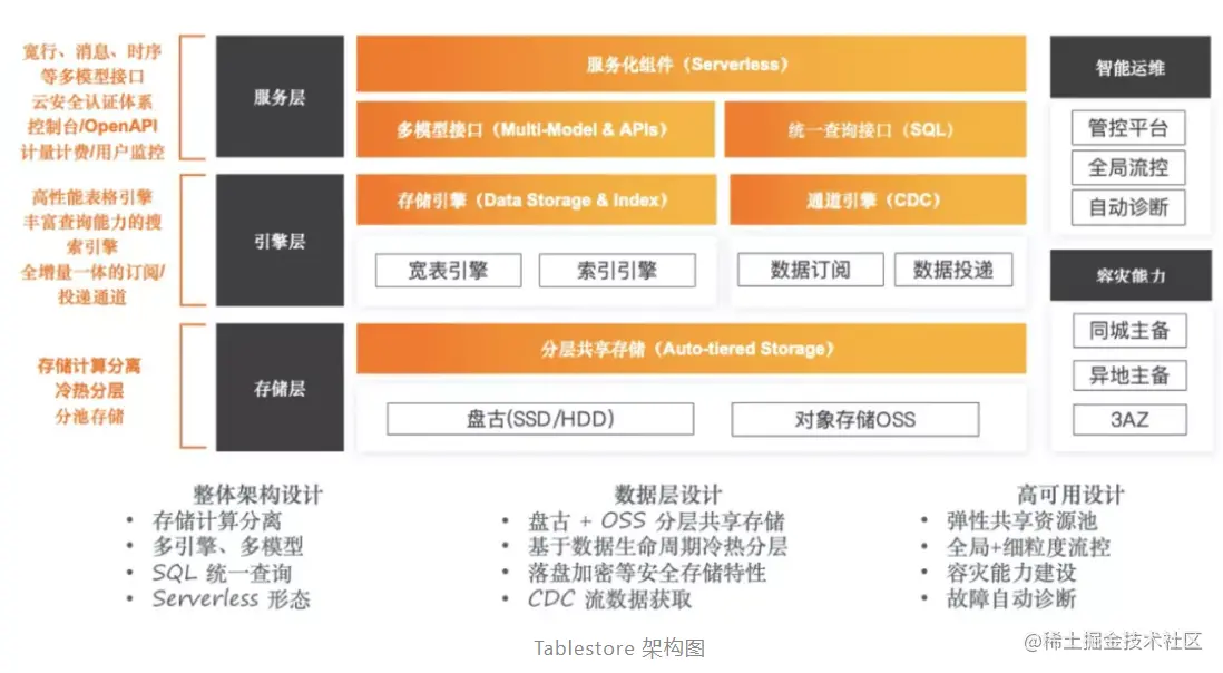 表格存储 Tablestore 具备 HBase 和 ElasticSearch 的融合功能,拥有极致弹性体验、免运维、即开即用的特性,支持 GB 到 PB 的弹性存储和 十万级 TPS 服务能力的无感知扩展。支撑海量的表数据的同时,提供丰富的数据检索与分析能力,是集存储、搜索和分析多功能一体的一站式结构化数据存储平台。