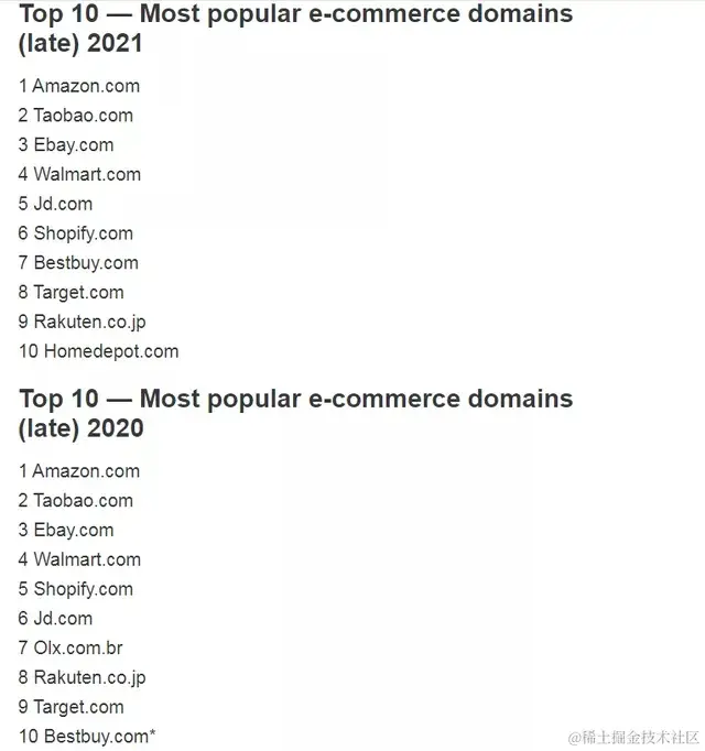 京东在2021年超越了Shopify.com,占据了第5位,而Bestbuy.com和Target.com也是一年又一年的上涨。