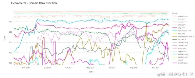 电商榜单第五位的中国巨头京东有几个时期也进入了前100名,主要是在5月,尤其是6月—— 2021年6月18日618购物活动当天,达到了在我们名单上排名第68,击败Walmart.com 并几乎赶上 Ebay.com。