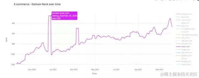 全球华人在线快时尚零售商Shein.com(希音)在我们2020年圣诞节的排名中名列前茅——它在2020年12月19日至24日期间领先于 Bestbuy.com 和 Target.com,达到第253位。在3月份,它又出现了一个高峰,在网络星期一之后,它在我们的排名中获得了2021年的最佳位置——它在2021年12月1日达到了第301位。
