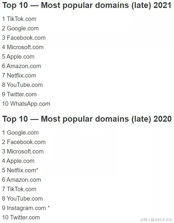 为什么给大家普及这个概念?因为今天国外某知名跨国科技企业(注:安全圈的应该都知道)根据各家数据的访问量,发布了一份2021年终统计数据,盘点下来公开给大家作为参考。