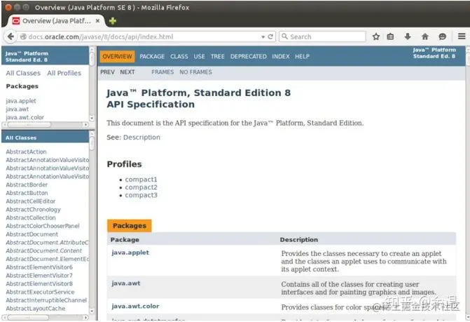 Javadoc是一个由Oracle提供的文件产生器。它将特殊格式的注释解析为HTML文档。下面的屏幕截图显示了Javadoc生成的Java SE 8 API规范:
