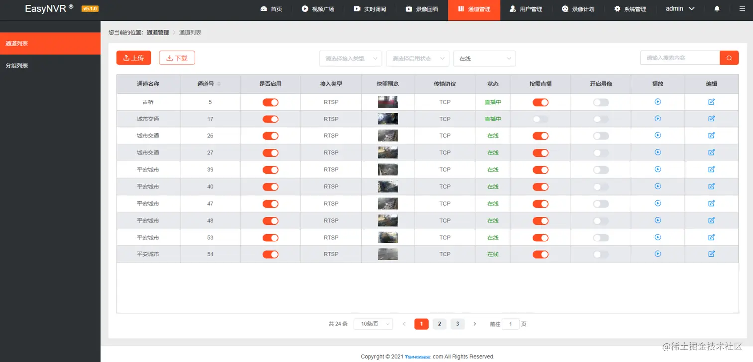 目前传统安防行业已经竞争已经非常激烈,方案也很成熟,但是随着互联网、移动终端的发展,传统安防已经明显落伍,与智能分析相结合的安防产品在市场上占比越来越大。TSINGSEE青犀视频开发的EasyNVR智能视频管理平台,就能够较好适应目前安防监控的需求,可以直接通过网页观看安防监控,管理人员可对所有视频通道进行分级及统一管理。